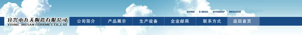 宜兴市九天陶瓷有限公司 地 址:江苏省宜兴市川埠村 手 机:13961794157 传 真:0510-87480169 税 号:320282782740918 开户行:农行宜兴市陶都开发区办事处 账 号:645801040007629 网 址:www.yxjtc.cn 邮 箱:web@yxjtc.cn